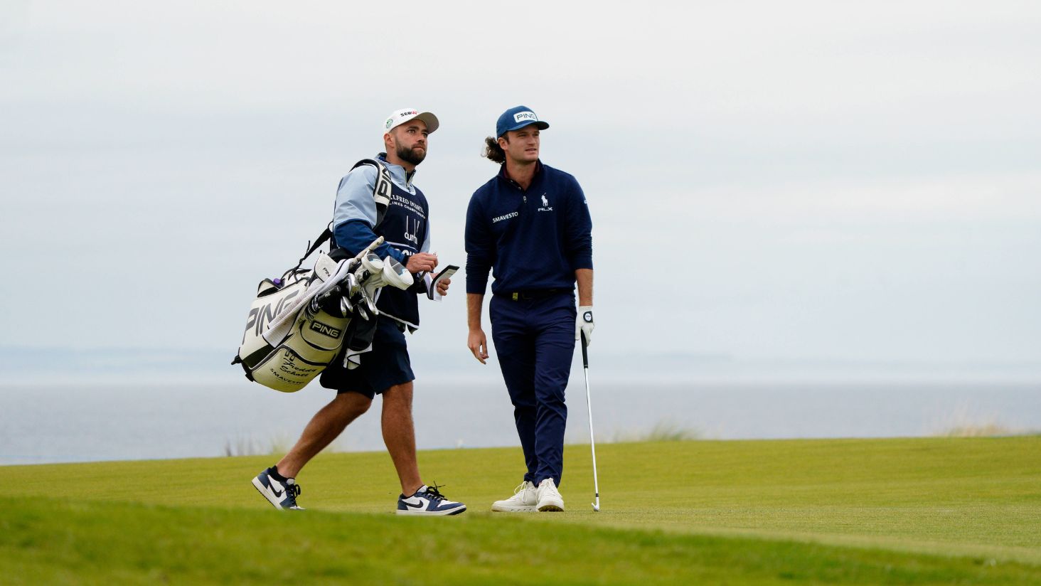 Freddy Schott mit seinem Caddie auf der DP World Tour in Schottland. (Foto: Imago / Golffile Thos Caffrey)