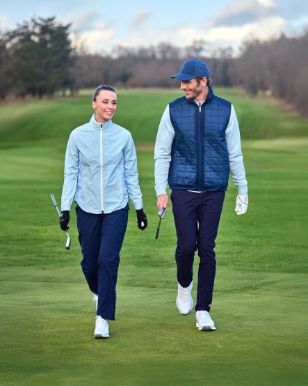 Uneingeschränkte Beweglichkeit: Der Golfschwung erfordert volle Bewegungsfreiheit. Aus diesem Grund sind die Kleidungsstücke mit Stretch-Material oder 4-Wege-Stretch ausgestattet. Die ThermoSeries Longsleeve Polos für Damen mit ihrer Raglan-Ärmel-Konstruktion und das gebürstete Stretch-Material der ThermoSeries Herren Golfhose sind so konzipiert, dass sie die Spielerin und den Spieler in keiner Bewegung einschränken.