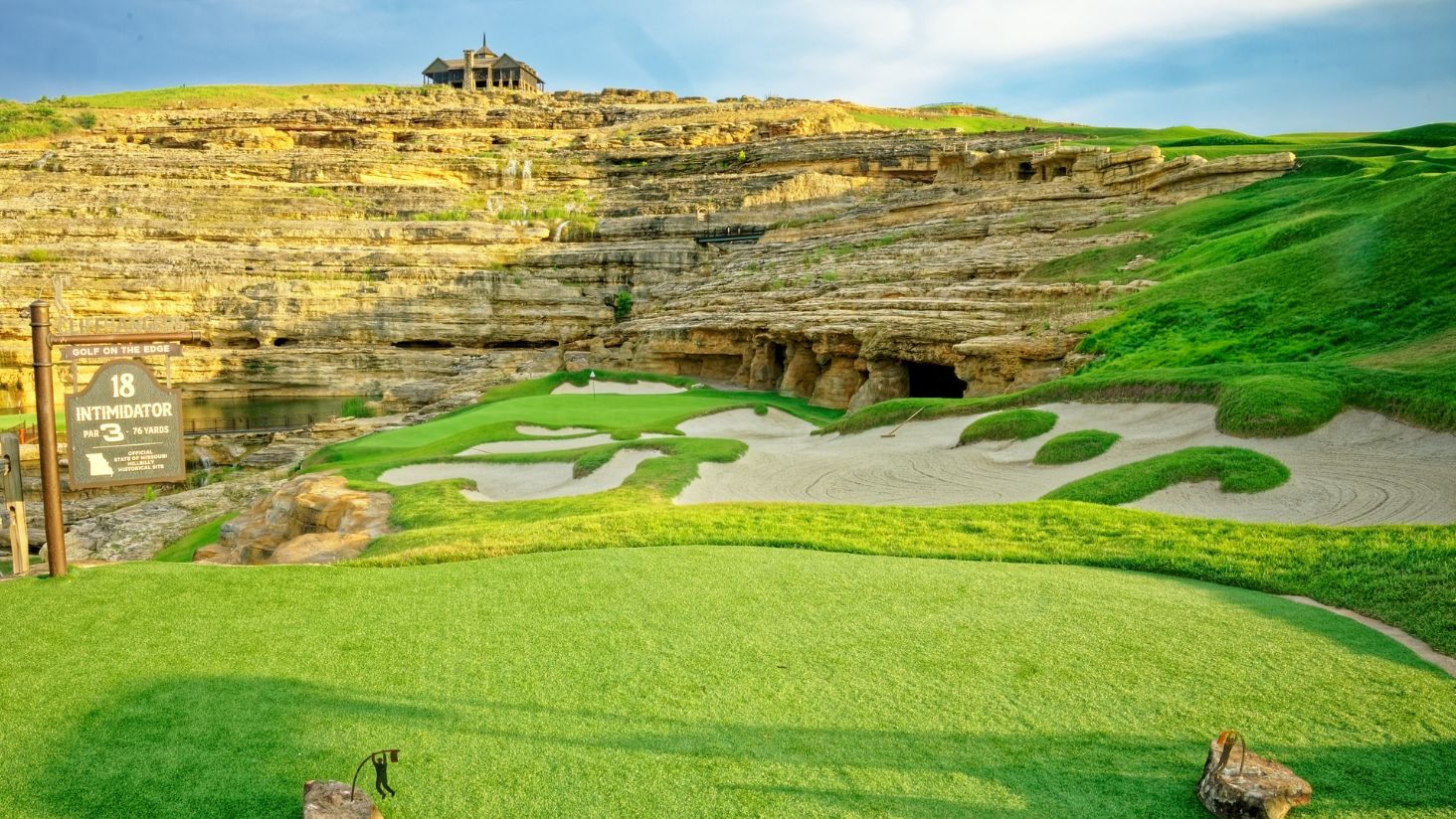 Das erkennt man bereits an der ersten Bahn: sie ist mit zwei Pin-Positionen versehen. Möchte man die vordere anspielen, ist vom Tee nur der Putter erlaubt. Wer die hintere Fahnenposition anspielen möchte, kann zum Wedge greifen. Die Bahnen 2 und 3 sorgen dann für echte Paukenschläge beim Design: an der nur 83 Yards langen zweiten Bahn spielt man vom Tee über einen kleinen Wasserfall Richtung Grün – und fährt danach mit dem Cart durch eben diesen Wasserfall Richtung Grün. Signature Hole ist zweifellos Bahn 3, Lion’s Den genannt. Sie bietet ein derzeit wohl einmaliges Erlebnis vom Tee. Ihren Namen erhielt die Bahn, weil man beim Bau des Platzes angeblich das Brüllen eines Berglöwen vernommen hat. Heute fährt man zum Abschlag in eine Höhle, das Brüllen des Berglöwen wird per Sensor und Audiofile zugesteuert. Dann tritt man in eine weitere Höhle – und spielt seinen Teeshot von einer Position hinter einem Wasserfall durch diesen hindurch auf das tiefer liegende Grün! An dieser Bahn sollte man ein paar Minuten mehr einplanen, denn kaum ein Golfer kommt hier ohne ausgiebigen Foto- und Videostop vorbei. Auch die weiteren Spielbahnen bringen immer wieder Höhenunterschiede, denn der Cliffhangers ist in die Landschaft von Payne’s Valley integriert. Bahn 6 trägt den Namen „Bunkers“ und erfordert einen hohen Teeshot über eine wahre Kraterlandschaft Richtung Fahne. Immer wieder sind die Grüns quer zum Berghang ausgerichtet, und an mehreren Bahnen muss der Abschlag über Wasser ausgeführt werden.