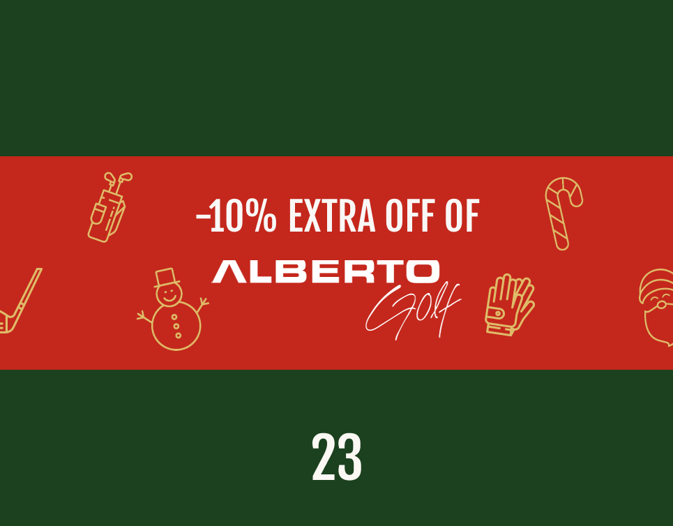 Dietro la ventitreesima porta del nostro calendario dell'Avvento Golfistico vi aspetta uno sconto di puro stile e massima funzionalità: solo oggi riceverete uno sconto EXTRA del 10% su tutta la gamma Alberto Golf! Il marchio è sinonimo di Pantaloni dotati delle più recenti tecnologie (come il 3xDry Cooler) che garantiscono sempre una vestibilità elegante e perfetta.
